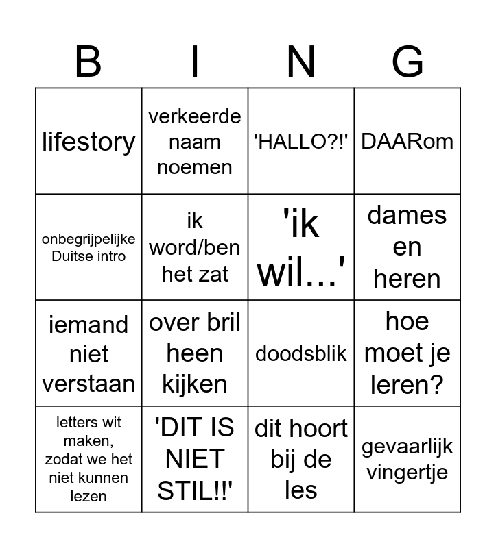 This bingo card has 16 words: 'DIT IS NIET STIL!!', hoe moet je leren?, 'HALLO?!', lifestory, iemand niet verstaan, verkeerde naam noemen, doodsblik, dit hoort bij de les, onbegrijpelijke Duitse intro, ik word/ben het zat, letters wit maken, zodat we het niet kunnen lezen, DAARom, over bril heen kijken, dames en heren, 'ik wil...' and gevaarlijk vingertje.
