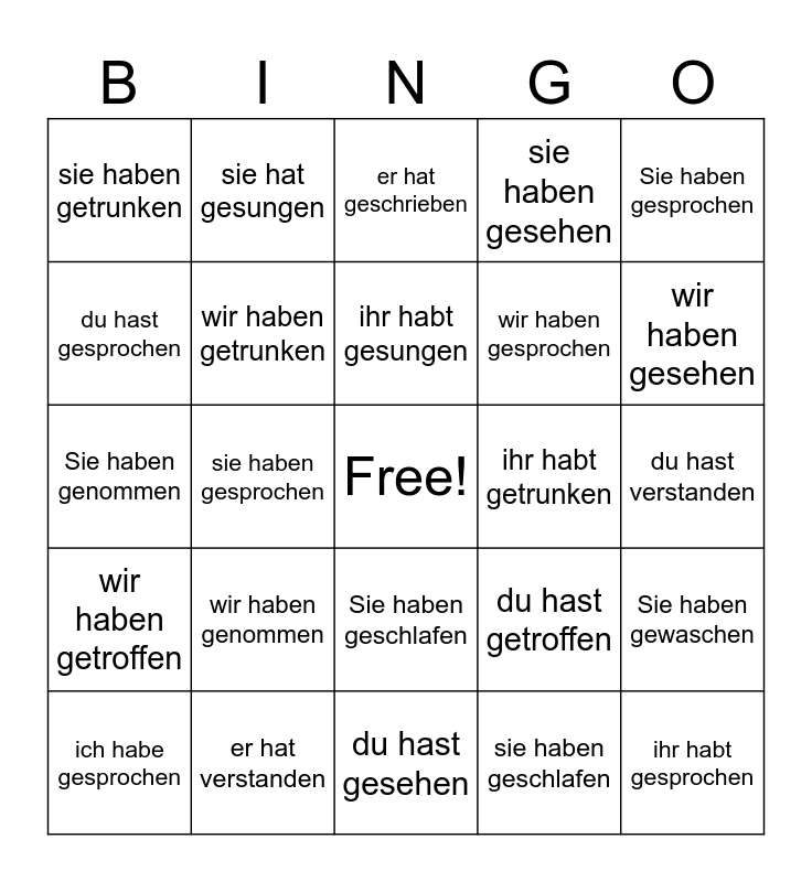 This bingo card has a free space and 82 words: ich habe geschrieben, du hast geschrieben, er hat geschrieben, sie hat geschrieben, wir haben geschrieben, ihr habt geschrieben, Sie haben geschrieben, sie haben geschrieben, ich habe getrunken, du hast getrunken, er hat getrunken, sie hat getrunken, wir haben getrunken, ihr habt getrunken, Sie haben getrunken, sie haben getrunken, ich habe gesprochen, du hast gesprochen, er hat gesprochen, sie hat gesprochen, es hat gesprochen, wir haben gesprochen, ihr habt gesprochen, Sie haben gesprochen, sie haben gesprochen, ich habe genommen, du hast genommen, er hat genommen, sie hat genommen, es hat genommen, wir haben genommen, ihr habt genommen, Sie haben genommen, sie haben genommen, ich habe gesehen, du hast gesehen, er hat gesehen, sie hat gesehen, wir haben gesehen, ihr habt gesehen, Sie haben gesehen, sie haben gesehen, ich habe gesungen, du hast gesungen, er hat gesungen, sie hat gesungen, wir haben gesungen, ihr habt gesungen, Sie haben gesungen, sie haben gesungen, ich habe verstanden, du hast verstanden, er hat verstanden, sie hat verstanden, wir haben verstanden, ihr habt verstanden, Sie haben verstanden, sie haben verstanden, ich habe getroffen, du hast getroffen, er hat getroffen, sie hat getroffen, wir haben getroffen, ihr habt getroffen, Sie haben getroffen, sie haben getroffen, ich habe geschlafen, du hast geschlafen, er hat geschlafen, sie hat geschlafen, wir haben geschlafen, ihr habt geschlafen, Sie haben geschlafen, sie haben geschlafen, ich habe gewaschen, du hast gewaschen, er hat gewaschen, sie hat gewaschen, wir haben gewaschen, ihr habt gewaschen, Sie haben gewaschen and sie haben gewaschen.