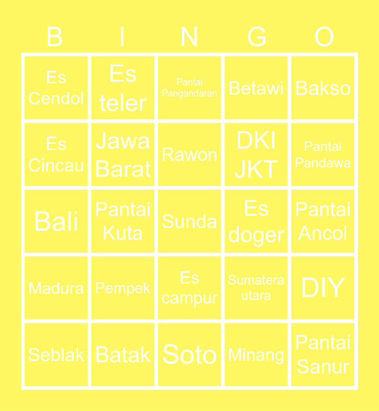 This bingo card has 25 words: Pempek, Soto, Rawon, Seblak, Bakso, Es Cendol, Es Cincau, Es teler, Es doger, Es campur, DKI JKT, Bali, Sumatera utara, DIY, Jawa Barat, Pantai Sanur, Pantai Ancol, Pantai Pangandaran, Pantai Pandawa, Pantai Kuta, Sunda, Batak, Madura, Betawi and Minang.
