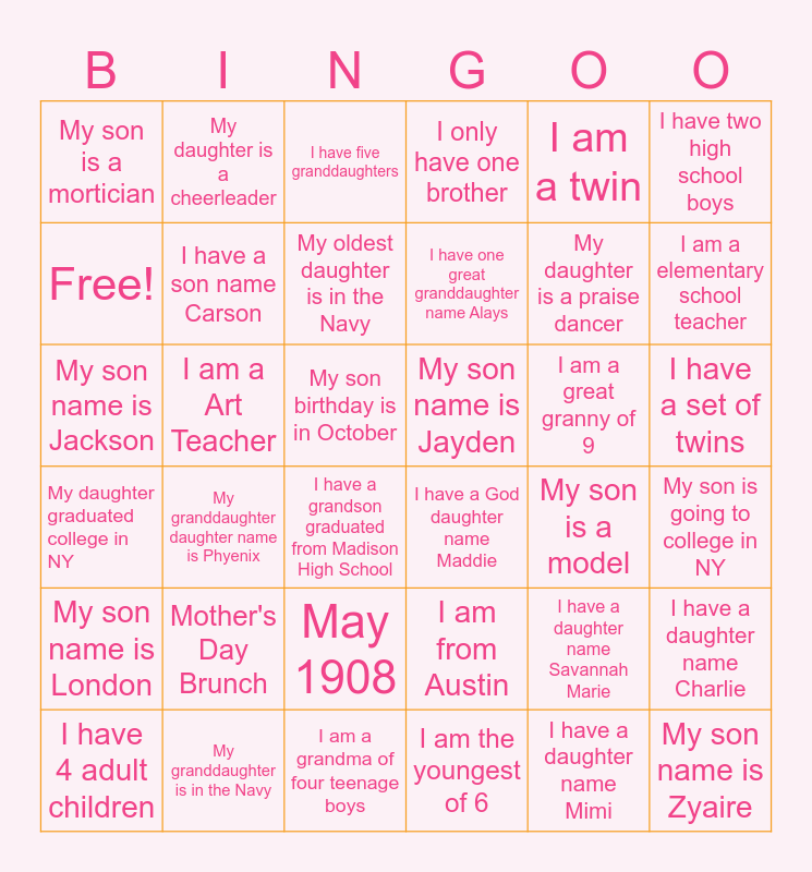 This bingo card has 36 words: My daughter graduated college in NY, My granddaughter daughter name is Phyenix, I am a grandma of four teenage boys, I have one great granddaughter name Alays, I am a great granny of 9, I have a set of twins, My son is a mortician, My granddaughter is in the Navy, I have five granddaughters, I am from Austin, My daughter is a praise dancer, I have two high school boys, My son name is London, I am a Art Teacher, My oldest daughter is in the Navy, I only have one brother, I have a daughter name Savannah Marie, My son is going to college in NY, Free!, I have a son name Carson, I have a grandson graduated from Madison High School, I have a God daughter name Maddie, My son is a model, I have a daughter name Charlie, My son name is Jackson, My daughter is a cheerleader, My son birthday is in October, I am the youngest of 6, I am a twin, I am a elementary school teacher, I have 4 adult children, Mother's Day Brunch, May 1908, My son name is Jayden, I have a daughter name Mimi and My son name is Zyaire.