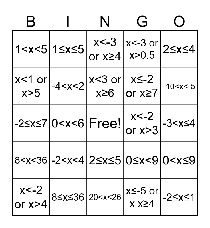 This bingo card has a free space and 25 words: -2<x<4, 20<x<26, x<3 or x≥6, x<-2 or x>4, 2≤x≤4, 1<x<5, x<1 or x>5, 1≤x≤5, x<-2 or x>3, 2≤x≤5, x≤-2 or x≥7, -2≤x≤7, 0≤x<9, 0<x≤9, -4<x<2, x≤9 or x≥2, -3<x≤4, x<-3 or x≥4, -10<x<-5, 0<x<6, -2≤x≤1, 8≤x≤36, 8<x<36, x<-3 or x>0.5 and x≤-5 or x x≥4.