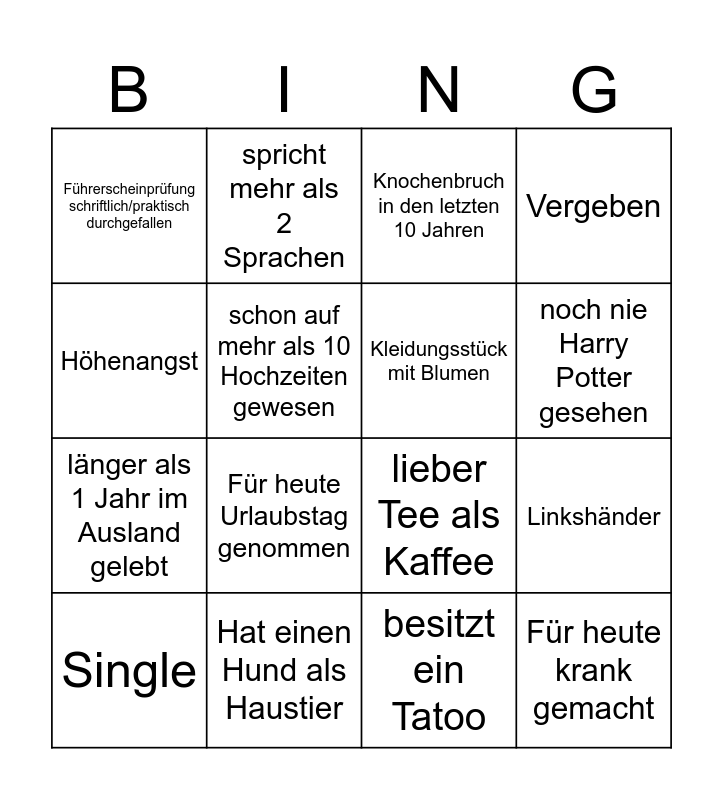 This bingo card has 16 words: Hat einen Hund als Haustier, Linkshänder, Knochenbruch in den letzten 10 Jahren, Führerscheinprüfung schriftlich/praktisch durchgefallen, länger als 1 Jahr im Ausland gelebt, spricht mehr als 2 Sprachen, lieber Tee als Kaffee, besitzt ein Tatoo, Höhenangst, schon auf mehr als 10 Hochzeiten gewesen, Single, Vergeben, Für heute Urlaubstag genommen, noch nie Harry Potter gesehen, Kleidungsstück mit Blumen and Für heute krank gemacht.