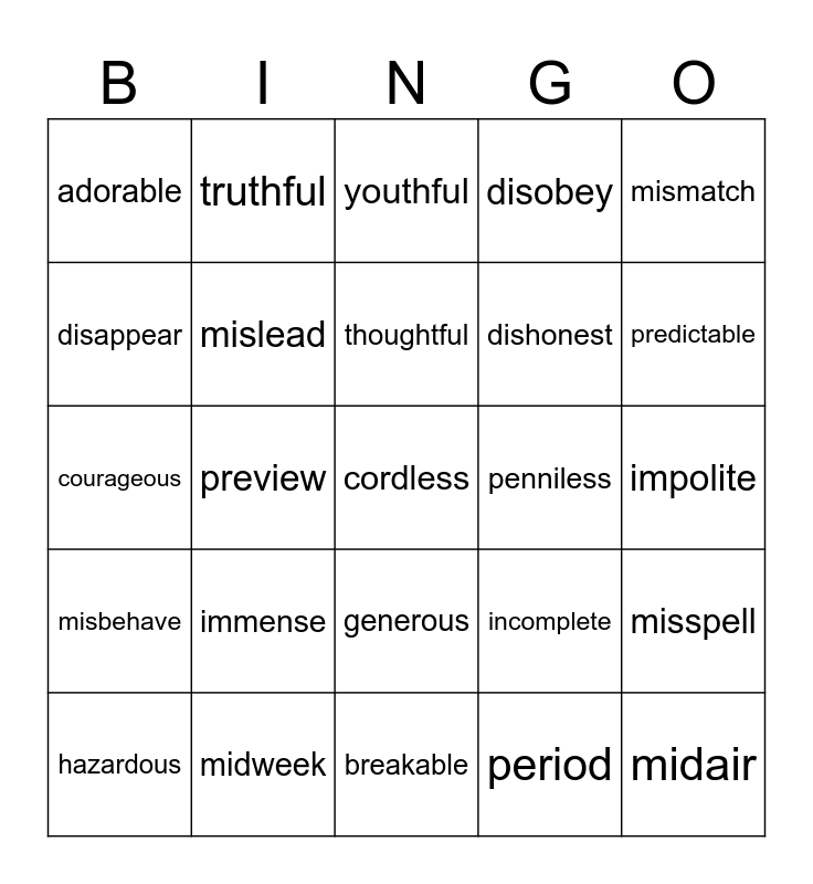 This bingo card has a free space and 32 words: period, prepay, preview, pretest, misbehave, mislead, mismatch, misspell, truthful, beautiful, thoughtful, youthful, endless, fearless, penniless, celebration, hazardous, courageous, generous, immense, incomplete, impatient, impolite, midweek, midair, disobey, dishonest, disappear, adorable, breakable, acceptable and predictable.