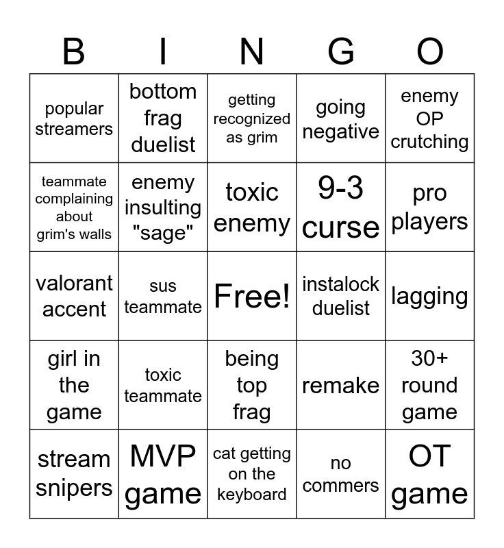 This bingo card has a free space and 25 words: stream snipers, toxic teammate, toxic enemy, no commers, pro players, popular streamers, bottom frag duelist, getting recognized as grim, 9-3 curse, 30+ round game, valorant accent, enemy insulting "sage", remake, OT game, teammate complaining about grim's walls, MVP game, cat getting on the keyboard, going negative, lagging, girl in the game, sus teammate, being top frag, instalock duelist, enemy OP crutching and afk players.