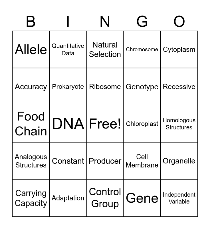 This bingo card has a free space and 52 words: Hypothesis, Independent Variable, Dependent Variable, Control Group, Constant, Trial, Quantitative Data, Qualitative Data, Accuracy, Polarity, Prokaryote, Eukaryote, Organelle, Cell Membrane, Nucleus, Mitochondria, Ribosome, Chloroplast, Cell Wall, Cytoplasm, DNA, Gene, Allele, Genotype, Phenotype, Homozygous, Heterozygous, Dominant, Recessive, Allele, Gene, Chromosome, Transcription, Translation, Enzyme, Natural Selection, Adaptation, Mutation, Speciation, Binomial Nomenclature, Phylogenetic Tree, Homologous Structures, Analogous Structures, Cladogram, Producer, Consumer, Decomposer, Food Chain, Biotic Factor, Abiotic Factor, Carrying Capacity and Succession.