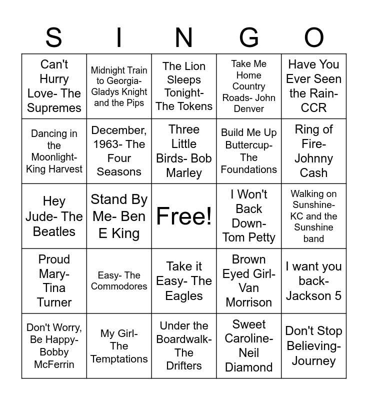 This bingo card has a free space and 30 words: My Girl- The Temptations, Lean on Me- Bill Withers, Stand By Me- Ben E King, Ain't No Mountain- Marvin Gaye, Can't Hurry Love- The Supremes, The Lion Sleeps Tonight- The Tokens, December, 1963- The Four Seasons, Take it Easy- The Eagles, I Won't Back Down- Tom Petty, Under the Boardwalk- The Drifters, Walking on Sunshine- KC and the Sunshine band, Don't Stop Believing- Journey, Sweet Caroline- Neil Diamond, Can't Help Falling In Love- Elvis Presley, Ring of Fire- Johnny Cash, Sweet Home Alabama- Lynyrd Skynyrd, Brown Eyed Girl- Van Morrison, Proud Mary- Tina Turner, Easy- The Commodores, Have You Ever Seen the Rain- CCR, Hey Jude- The Beatles, Twist and Shout-The Beatles, Midnight Train to Georgia- Gladys Knight and the Pips, Build Me Up Buttercup- The Foundations, Dancing in the Moonlight- King Harvest, Take Me Home Country Roads- John Denver, I want you back- Jackson 5, Don't Worry, Be Happy- Bobby McFerrin, Three Little Birds- Bob Marley and I Will Always Love You- Whitney Houston.
