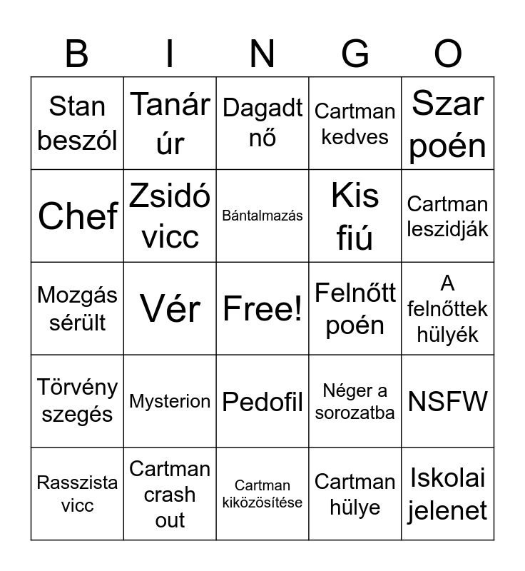 This bingo card has a free space and 24 words: Mysterion, Cartman crash out, Bántalmazás, Rasszista vicc, Szar poén, Stan beszól, Chef, Tanár úr, Felnőtt poén, Pedofil, Kis fiú, Mozgás sérült, Néger a sorozatba, NSFW, Zsidó vicc, Cartman hülye, A felnőttek hülyék, Dagadt nő, Cartman leszidják, Vér, Iskolai jelenet, Törvény szegés, Cartman kedves and Cartman kiközösítése.