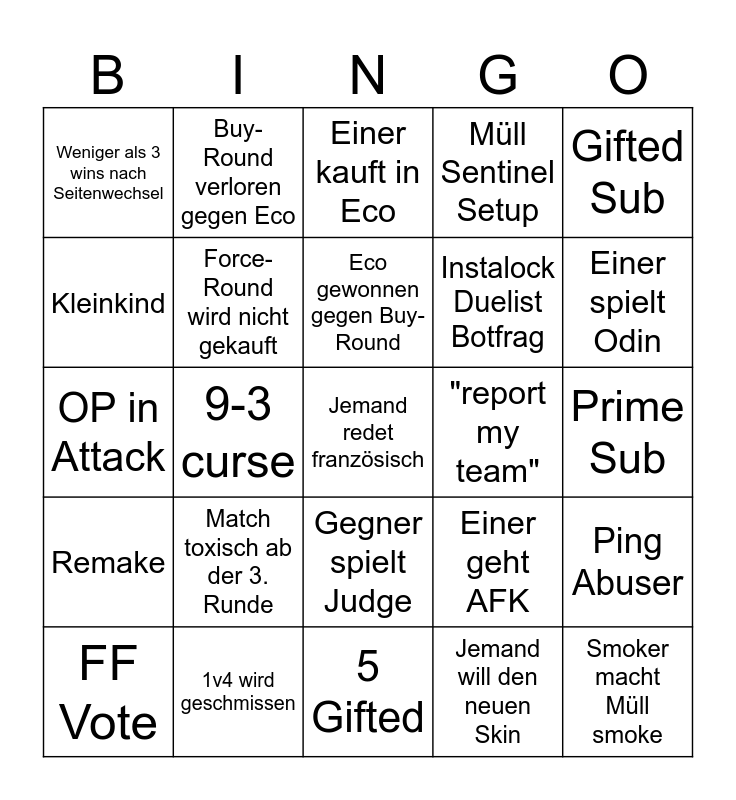 This bingo card has a free space and 34 words: Duelist geht lurken, Jemand will den neuen Skin, Komplettes Match ohne Callouts, Ein Deutscher beleidigt, Remake, Force-Round wird nicht gekauft, Gifted Sub, FF Vote, Buy-Round verloren gegen Eco, ACE, Eco gewonnen gegen Buy-Round, Einer kauft in Eco, Alle reden kein Englisch, Atl4s Crashout, "report my team", Einer spielt Odin, 1v4 wird geschmissen, OP in Attack, Match toxisch ab der 3. Runde, Einer geht AFK, Gegner spielt Judge, Von Teammate geflasht, Weniger als 3 wins nach Seitenwechsel, Prime Sub, 5 Gifted, Smoker macht Müll smoke, Müll Sentinel Setup, Mates gehen Crashout, Instalock Duelist Botfrag, Kleinkind, Pick me Girl, 9-3 curse, Ping Abuser and Enemy sehr sus.