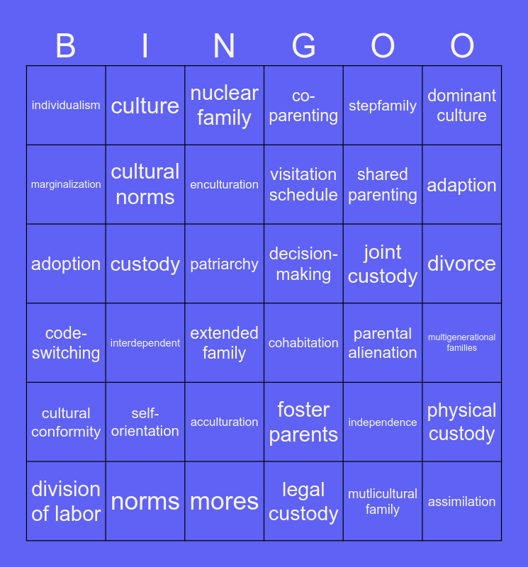 This bingo card has 45 words: Free!, adoption, childless family, extended family, foster parents, multigenerational families, nuclear family, single-parent family, stepfamily, cohabitation, co-parenting, custody, divorce, joint custody, legal custody, parental alienation, physical custody, shared parenting, sole custody, visitation schedule, culture, division of labor, independence, individualism, marriage, patriarchy, self-orientation, academics, code-switching, decision-making, identity, interdependent, mores, mutlicultural family, norms, adaption, acculturation, assimilation, cultural conformity, cultural norms, dominant culture, enculturation, integration, marginalization and monoculture.