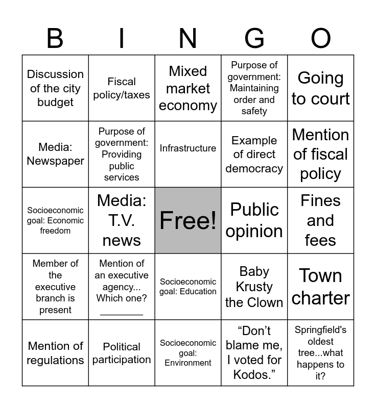 This bingo card has a free space and 24 words: Mention of an executive agency... Which one?________, Political participation, Infrastructure, Mention of regulations, Going to court, Discussion of the city budget, Media: Newspaper, Fiscal policy/taxes, Public opinion, Socioeconomic goal: Education, Example of direct democracy, Socioeconomic goal: Economic freedom, Baby Krusty the Clown, Town charter, Purpose of government: Providing public services, “Don’t blame me, I voted for Kodos.”, Fines and fees, Mixed market economy, Mention of fiscal policy, Media: T.V. news, Springfield's oldest tree...what happens to it?, Member of the executive branch is present, Purpose of government: Maintaining order and safety and Socioeconomic goal: Environment.