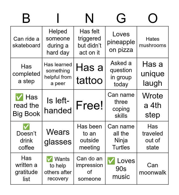 This bingo card has a free space and 125 words: Has a tattoo, ✅ Has been clean/sober 30+ days, ✅ Has a favorite recovery slogan, ✅ Likes pineapple on pizza, ✅ Has more than 2 siblings, ✅ Has been to jail, ✅ Doesn’t drink coffee, ✅ Has a pet, ✅ Loves 90s music, ✅ Has cried in group, ✅ Knows how to cook, ✅ Has made amends, ✅ Is afraid of clowns, ✅ Has been in another treatment program, ✅ Has a favorite step, ✅ Has done service work, ✅ Wants to help others after recovery, ✅ Likes country music, ✅ Is left-handed, ✅ Has watched a whole season of a show in one day, ✅ Has shared in a meeting this week, ✅ Has read the Big Book, ✅ Plays or played a sport, ✅ Can name 3 coping skills, ✅ Was resistant to group at first, Has a tattoo, Loves pineapple on pizza, Can cook more than three meals from scratch, Has more than two siblings, Prefers cats over dogs, Has traveled out of state, Is afraid of clowns, Is left-handed, Wears glasses, Has a birthday this month, Can whistle loudly, Likes scary movies, Loves country music, Has never flown on a plane, Plays (or used to play) a musical instrument, Can ride a skateboard, Can recite a rap song, Is a parent, Snores loudly, Likes watching reality TV, Has dyed their hair a wild color, Has broken a bone, Hates mushrooms, Has met someone famous, Doesn’t drink coffee, Has been to detox, Has been clean/sober for 30+ days, Has a favorite step, Has been to jail, Has been in more than one treatment program, Has done service work, Has a sponsor, Has shared in a meeting this week, Has cried during a meeting, Can name three coping skills, Has completed a step, Has experienced relapse and returned to recovery, Attended a self-help meeting today, Has helped someone else stay sober, Was resistant to treatment at first, Knows what HALT stands for, Can name 3 recovery slogans, Has been to an outside meeting, Has a favorite chair in group, Wrote a 4th step, Attended group even when they didn’t want to, Prefers group to individual therapy, Can recite part of the Serenity Prayer, Feels nervous about graduation/discharge, Wants to work in recovery someday, Has made an amends, Feels more hopeful than they did a week ago, Struggles with anger, Believes in second chances, Identifies as spiritual, Struggles with trust, Had a hard time opening up in group, Has felt shame but learned from it, Has written a gratitude list, Has learned something helpful from a peer, Has had a sponsor or mentor, Struggles with setting boundaries, Misses someone from their past, Felt proud of themselves this week, Has a self-care routine, Feels different than they did on day one, Wants to improve family relationships, Finds it hard to ask for help, Has forgiven themselves for something, Has felt triggered but didn’t act on it, Can do an impression of someone, Knows a dad joke, Can sing every word of a theme song, Laughed so hard they cried, Can moonwalk, Would survive a zombie apocalypse, Can name all the Ninja Turtles, Loves a weird food combo, Dances when no one’s watching, Has a favorite Disney movie, Still remembers their MySpace password, Can do a cartwheel, Has a unique laugh, Talks in their sleep, Hates the sound of chewing, Has a “guilty pleasure” show, Has been Rickrolled, Can name all the Seven Dwarfs, Knows what “WAP” stands for, Once got stuck somewhere weird, Has given someone a compliment in group, Was late to group once this week, Has encouraged someone to stay, Has been peer-elected for something, Asked a question in group today, Got called out by the facilitator (constructively!), Volunteered to go first in an activity, Feels like they’ve grown since arriving, Helped someone during a hard day and Feels part of the group.