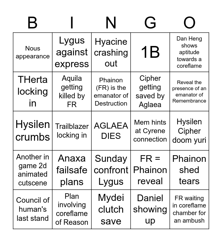 This bingo card has a free space and 24 words: Anaxa failsafe plans, Plan involving coreflame of Reason, Phainon (FR) is the emanator of Destruction, Council of human's last stand, Dan Heng shows aptitude towards a coreflame, Nous appearance, THerta locking in, Lygus against express, Mem hints at Cyrene connection, Sunday confront Lygus, Cipher getting saved by Aglaea, Hysilen crumbs, FR = Phainon reveal, Phainon shed tears, Aquila getting killed by FR, Daniel showing up, Hysilen Cipher doom yuri, Hyacine crashing out, Reveal the presence of an emanator of Remembrance, Trailblazer locking in, FR waiting in coreflame chamber for an ambush, Another in game 2d animated cutscene, 1B and Mydei clutch save.
