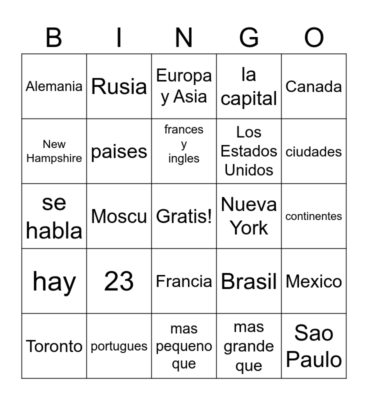 This bingo card has a free space and 24 words: 23, portugues, frances y ingles, Toronto, Canada, Alemania, New Hampshire, Rusia, Nueva York, Francia, Los Estados Unidos, se habla, Brasil, Mexico, paises, mas grande que, continentes, Europa y Asia, ciudades, Moscu, Sao Paulo, hay, la capital and mas pequeno que.