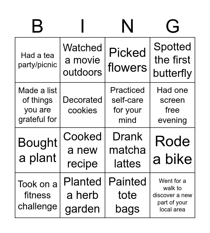 This bingo card has 16 words: Planted a herb garden, Rode a bike, Picked flowers, Had a tea party/picnic, Bought a plant, Watched a movie outdoors, Drank matcha lattes, Painted tote bags, Made a list of things you are grateful for, Decorated cookies, Took on a fitness challenge, Spotted the first butterfly, Cooked a new recipe, Had one screen free evening, Practiced self-care for your mind and Went for a walk to discover a new part of your local area.