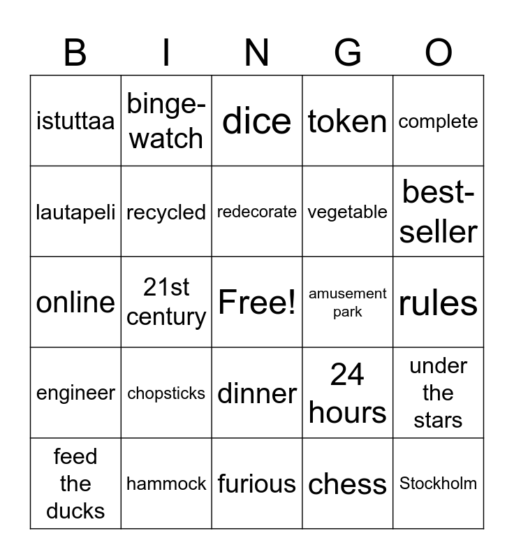 This bingo card has a free space and 24 words: chopsticks, hammock, redecorate, feed the ducks, complete, istuttaa, lautapeli, binge-watch, amusement park, dinner, vegetable, online, 24 hours, under the stars, recycled, chess, rules, dice, best-seller, 21st century, Stockholm, engineer, token and furious.