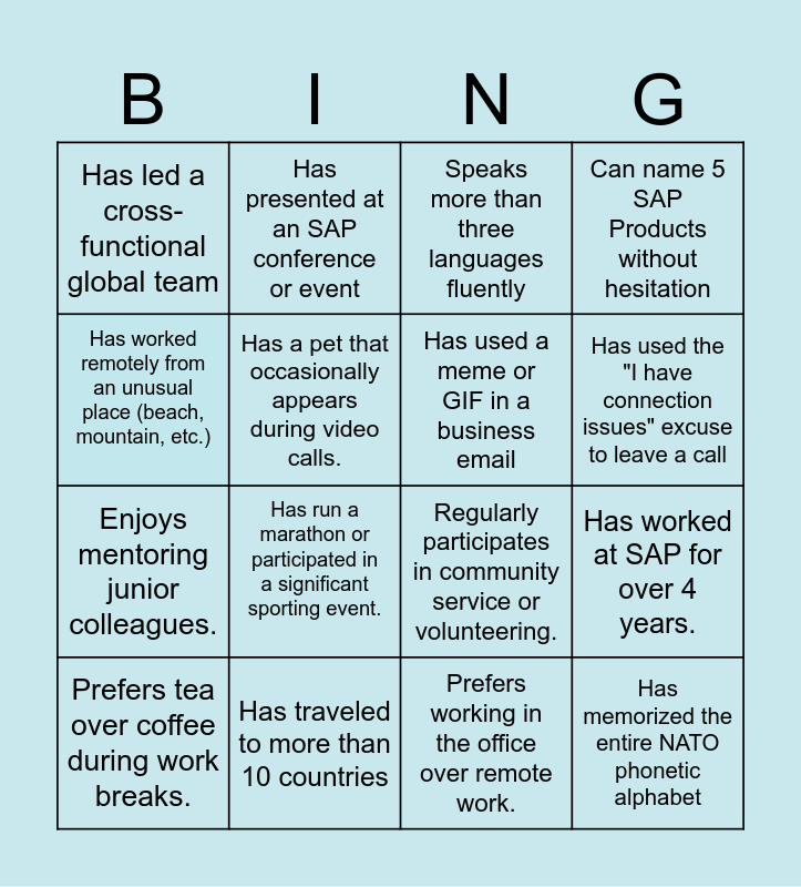 This bingo card has 16 words: Has traveled to more than 10 countries, Has worked at SAP for over 4 years., Speaks more than three languages fluently, Has led a cross-functional global team, Enjoys mentoring junior colleagues., Has presented at an SAP conference or event, Regularly participates in community service or volunteering., Prefers working in the office over remote work., Has worked remotely from an unusual place (beach, mountain, etc.), Has a pet that occasionally appears during video calls., Prefers tea over coffee during work breaks., Can name 5 SAP Products without hesitation, Has run a marathon or participated in a significant sporting event., Has used the "I have connection issues" excuse to leave a call, Has used a meme or GIF in a business email and Has memorized the entire NATO phonetic alphabet.