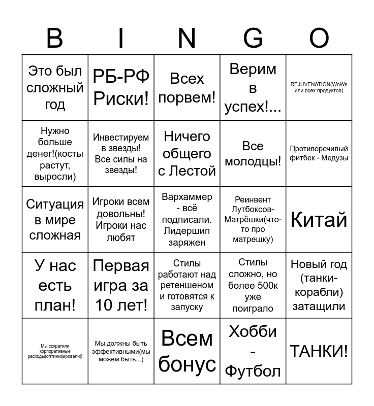 This bingo card has 25 words: Первая игра за 10 лет!, Всем бонус, Ничего общего с Лестой, Мы сократили корпоративные расходы(оптимизировали)!, REJUVENATION(WoWs или всех продуктов), Это был сложный год, Нужно больше денег!(косты растут, выросли), РБ-РФ Риски!, Реинвент Лутбоксов-Матрёшки(что-то про матрешку), Стилы работают над ретеншеном и готовятся к запуску, Все молодцы!, Ситуация в мире сложная, Стилы сложно, но более 500к уже поиграло, Новый год (танки-корабли) затащили, Инвестируем в звезды! Все силы на звезды!, ТАНКИ!, Китай, Всех порвем!, Противоречивый фитбек - Медузы, Игроки всем довольны! Игроки нас любят, Вархаммер - всё подписали. Лидершип заряжен, Мы должны быть эффективными(мы можем быть...), У нас есть план!, Верим в успех!... and Хобби - Футбол.