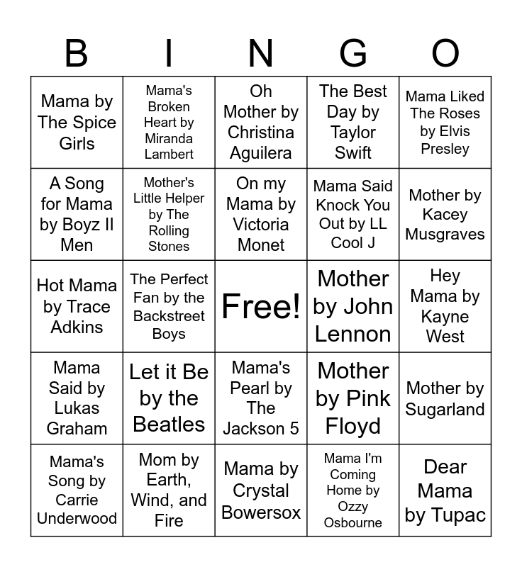 This bingo card has a free space and 24 words: Let it Be by the Beatles, Mom by Earth, Wind, and Fire, On my Mama by Victoria Monet, Mama's Song by Carrie Underwood, Mama Liked The Roses by Elvis Presley, Mama by The Spice Girls, A Song for Mama by Boyz II Men, Mama's Broken Heart by Miranda Lambert, Mother by John Lennon, Mama's Pearl by The Jackson 5, Mama Said Knock You Out by LL Cool J, Hot Mama by Trace Adkins, Mother by Pink Floyd, Mother by Sugarland, Mother's Little Helper by The Rolling Stones, Mama I'm Coming Home by Ozzy Osbourne, Hey Mama by Kayne West, Oh Mother by Christina Aguilera, Mother by Kacey Musgraves, The Perfect Fan by the Backstreet Boys, Dear Mama by Tupac, Mama Said by Lukas Graham, The Best Day by Taylor Swift and Mama by Crystal Bowersox.