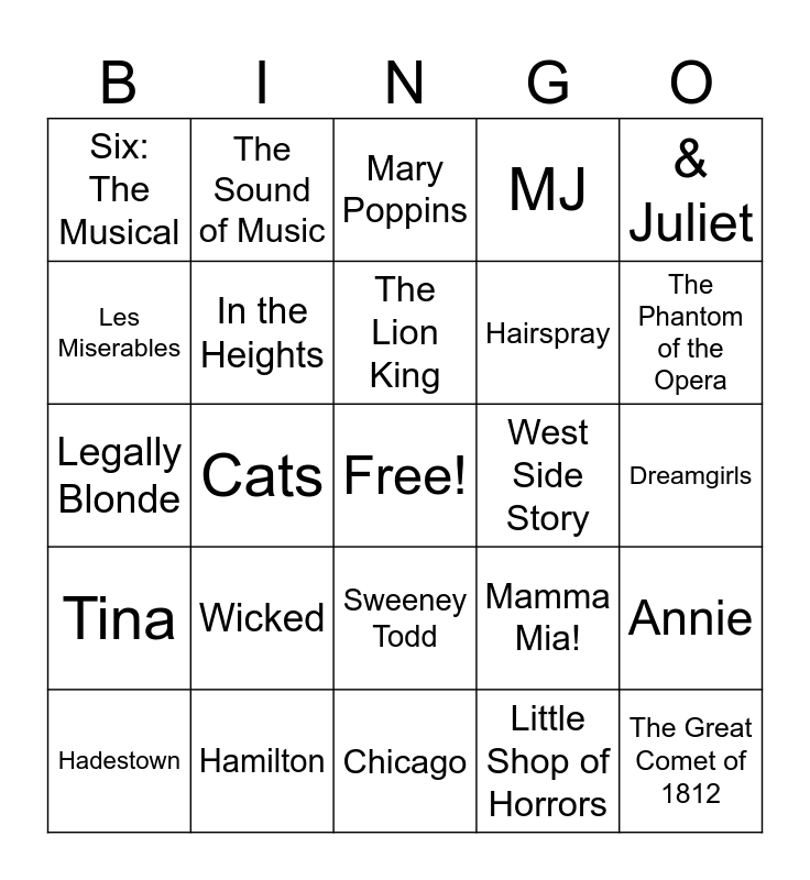 This bingo card has a free space and 24 words: Wicked, Hamilton, The Lion King, Hadestown, & Juliet, Six: The Musical, Les Miserables, The Sound of Music, West Side Story, Sweeney Todd, Hairspray, Legally Blonde, Mamma Mia!, Annie, In the Heights, Little Shop of Horrors, Dreamgirls, Mary Poppins, The Phantom of the Opera, Cats, The Great Comet of 1812, Tina, MJ and Chicago.