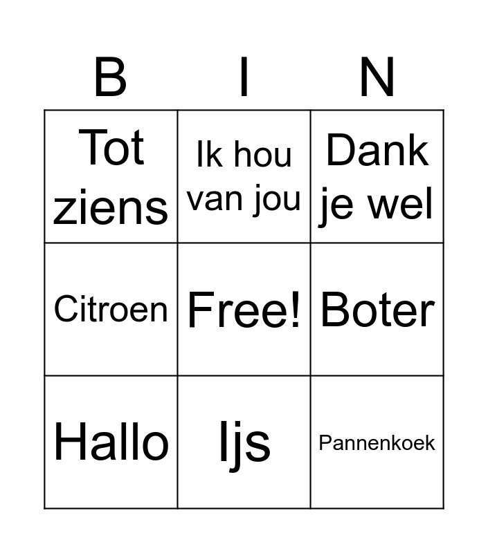 This bingo card has a free space and 8 words: Boter, Dank je wel, Ik hou van jou, Hallo, Tot ziens, Pannenkoek, Citroen and Ijs.