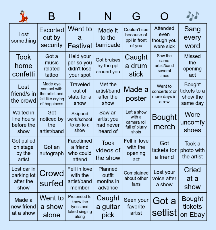 This bingo card has a free space and 48 words: Complained about other fans, Saw the same artist/band several times, Caught a guitar pick, Got noticed by the artist/band, Traveled out of state for a show, Wore uncomfy shoes, Escorted out by security, Went to a show alone, Attended even though you were sick, Took videos of the show, Sang every word, Made it to the barricade, Went to concerts 2 or more days in a row, Made a poster, Lost car in parking lot after the show, Bought merch, Took home confetti, Missed the opening act, Lost your voice after a show, Couldn't see because of ppl in front of you, Caught a drum stick, Skipped work/school to go to a show, Lost something, Got a music related tattoo, Cried at a show, Held your per so you didn't lose your spot, Bought tickets to a show the same day, Made a new friend at a show, Met the artist/band after the show, Made eye contact with the artist and felt like crying of happiness, Got a setlist, Left a show with a camera roll full of blurry shots, Took a photo with the artist, Crowd surfed, Waited in line hours before the show, Fell in love with the opening act, Got tickets for a friend, Lost friend/s in the crowd, Facetimed a friend who could attend, Fell in love with the artist/band member, Got pulled on stage by the artist, Bought tickets on Ebay, Went to a Festival, Pretended to know the lyrics and faked singing along, Got bruises by the ppl around you, Planned outfit months in advance, Got an autograph and Seen your favorite artist.
