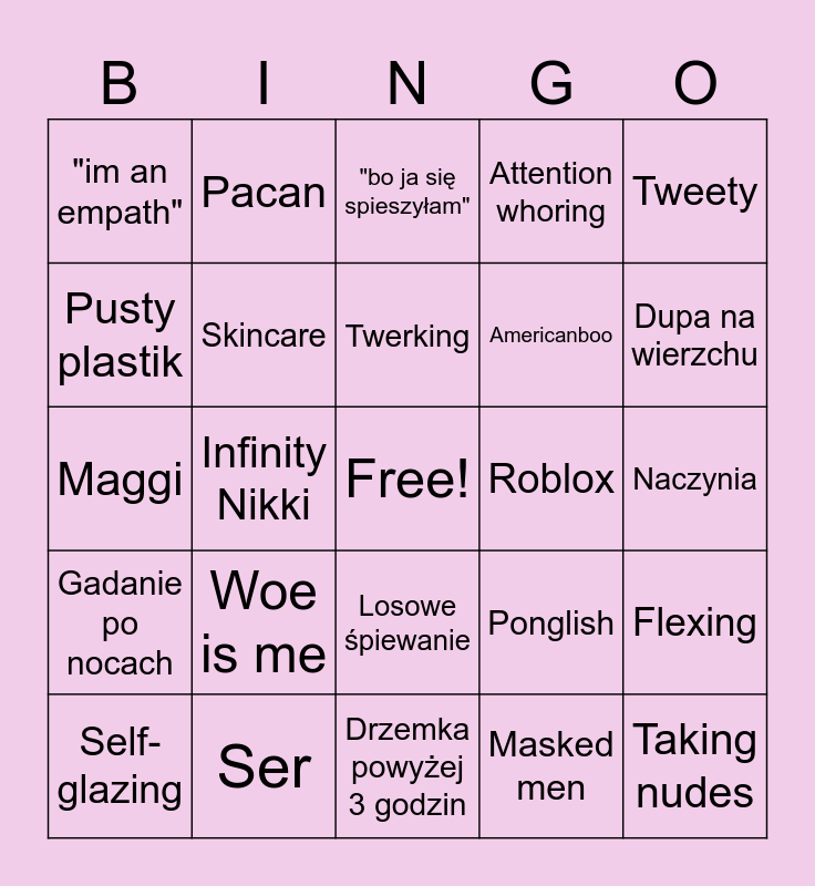 This bingo card has a free space and 24 words: Woe is me, Ser, Twerking, Self-glazing, Tweety, "im an empath", Pusty plastik, Pacan, Roblox, Losowe śpiewanie, Americanboo, Maggi, Ponglish, Flexing, Skincare, Masked men, Naczynia, "bo ja się spieszyłam", Dupa na wierzchu, Infinity Nikki, Taking nudes, Gadanie po nocach, Attention whoring and Drzemka powyżej 3 godzin.