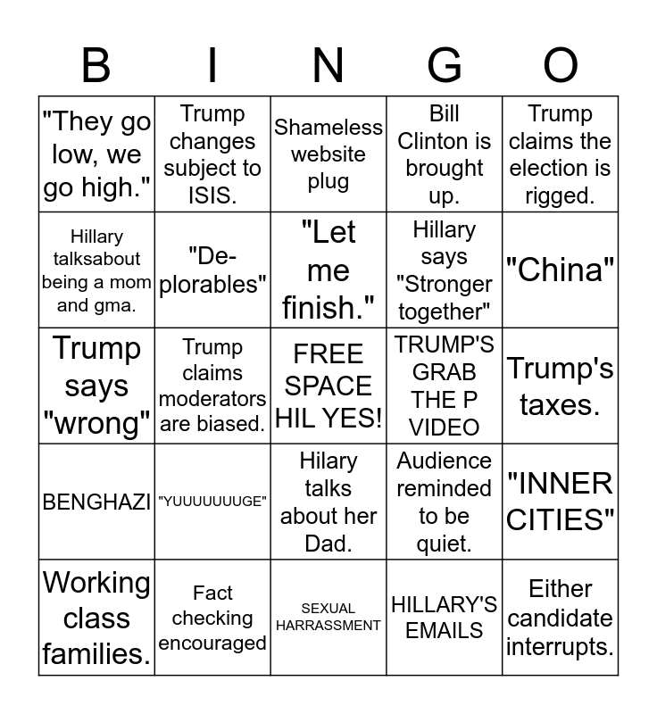 This bingo card has a free space and 24 words: "YUUUUUUUGE", Fact checking encouraged, "Let me finish.", Working class families., Trump claims the election is rigged., "They go low, we go high.", Hillary talksabout being a mom and gma., Trump changes subject to ISIS., TRUMP'S GRAB THE P VIDEO, Hilary talks about her Dad., Hillary says "Stronger together", Trump says "wrong", Audience reminded to be quiet., "INNER CITIES", "De-plorables", HILLARY'S EMAILS, Trump's taxes., Shameless website plug, "China", Trump claims moderators are biased., Either candidate interrupts., BENGHAZI, Bill Clinton is brought up. and SEXUAL HARRASSMENT.