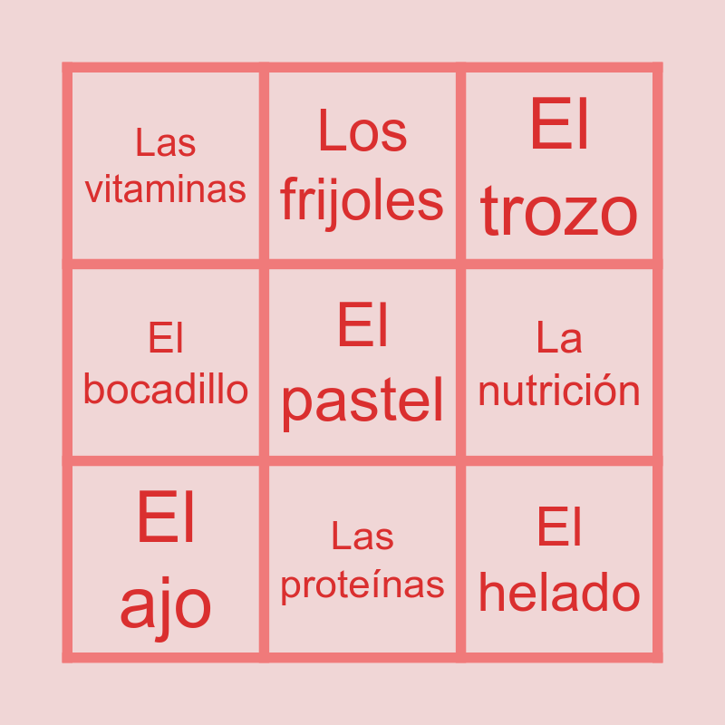 This bingo card has 14 words: Free!, Los pimientos, El ajo, Los frijoles, El bocadillo, El pastel, El helado, Los carbohidratos, Las proteínas, Las vitaminas, La comida Rápida, La nutrición, El trozo and La receta.