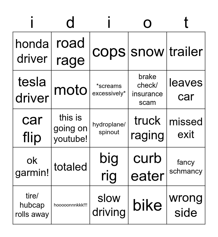 This bingo card has a free space and 24 words: totaled, hooooonnnkkk!!!, *screams excessively*, tire/ hubcap rolls away, trailer, honda driver, tesla driver, road rage, truck raging, big rig, brake check/ insurance scam, car flip, curb eater, fancy schmancy, moto, bike, missed exit, cops, leaves car, this is going on youtube!, wrong side, ok garmin!, snow and slow driving.