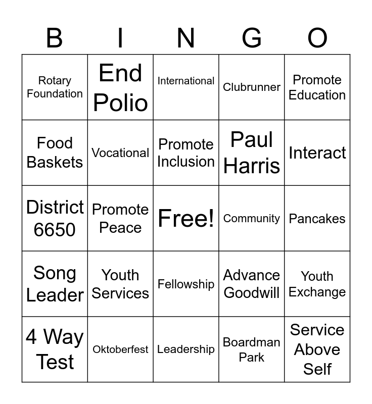 This bingo card has a free space and 29 words: 4 Way Test, RYLA, Promote Peace, Club Service, Rotary Foundation, International, Vocational, Youth Services, Community, Oktoberfest, Pancakes, Service Above Self, Leadership, Boardman Park, Interact, Fight Diseases, Fellowship, Song Leader, Promote Education, District 6650, Advance Goodwill, Clean Water, Paul Harris, Food Baskets, Clubrunner, End Polio, Youth Exchange, Promote Inclusion and Purple Pinky.