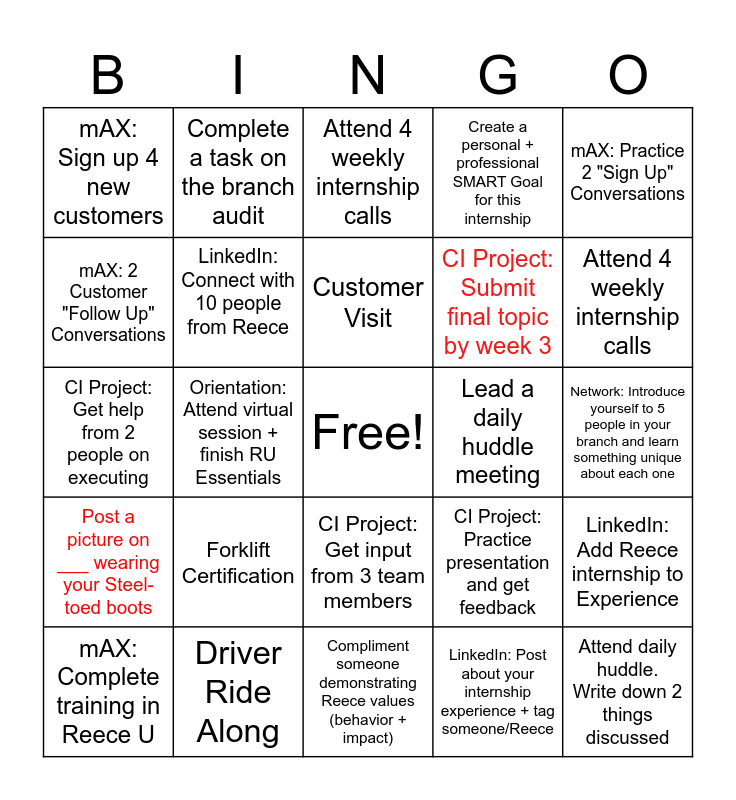 This bingo card has a free space and 24 words: Forklift Certification, Driver Ride Along, Customer Visit, mAX: Complete training in Reece U, mAX: Practice 2 "Sign Up" Conversations, mAX: Sign up 4 new customers, mAX: 2 Customer "Follow Up" Conversations, Complete a task on the branch audit, Lead a daily huddle meeting, CI Project: Get input from 3 team members, CI Project: Submit final topic by week 3, CI Project: Get help from 2 people on executing, CI Project: Practice presentation and get feedback, LinkedIn: Add Reece internship to Experience, LinkedIn: Connect with 10 people from Reece, LinkedIn: Post about your internship experience + tag someone/Reece, Network: Introduce yourself to 5 people in your branch and learn something unique about each one, Attend 4 weekly internship calls, Attend 4 weekly internship calls, Orientation: Attend virtual session + finish RU Essentials, Attend daily huddle. Write down 2 things discussed, Post a picture on ___ wearing your Steel-toed boots, Create a personal + professional SMART Goal for this internship and Compliment someone demonstrating Reece values (behavior + impact).