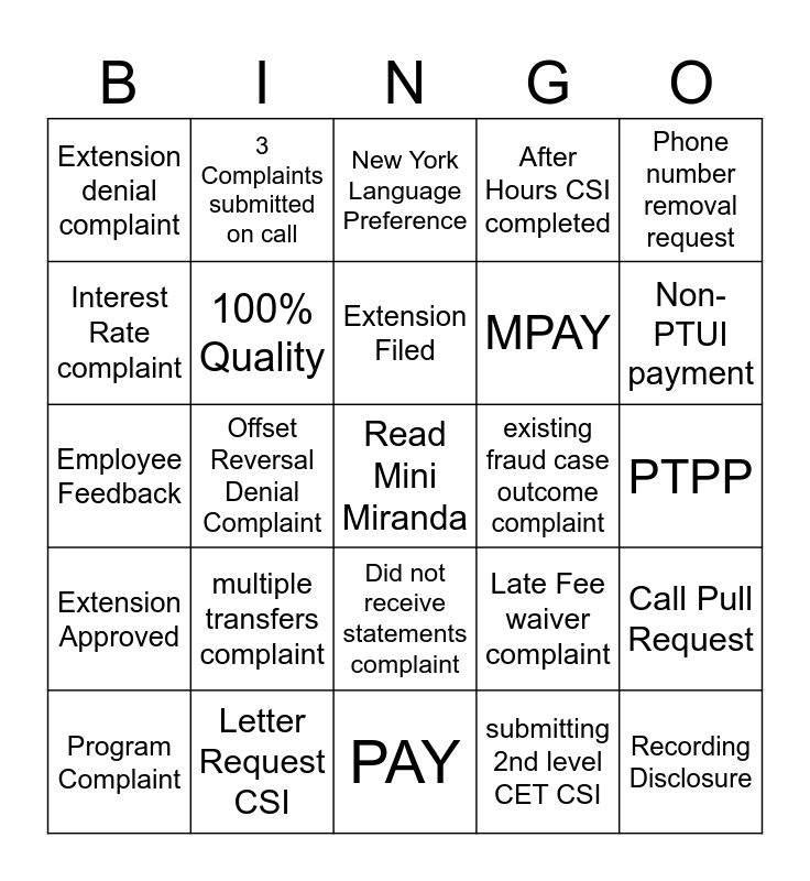This bingo card has a free space and 24 words: multiple transfers complaint, Letter Request CSI, Extension Filed, Program Complaint, Phone number removal request, Extension denial complaint, Interest Rate complaint, 3 Complaints submitted on call, existing fraud case outcome complaint, Did not receive statements complaint, MPAY, Employee Feedback, Late Fee waiver complaint, Call Pull Request, 100% Quality, submitting 2nd level CET CSI, PTPP, New York Language Preference, Non-PTUI payment, Offset Reversal Denial Complaint, Recording Disclosure, Extension Approved, After Hours CSI completed and PAY.