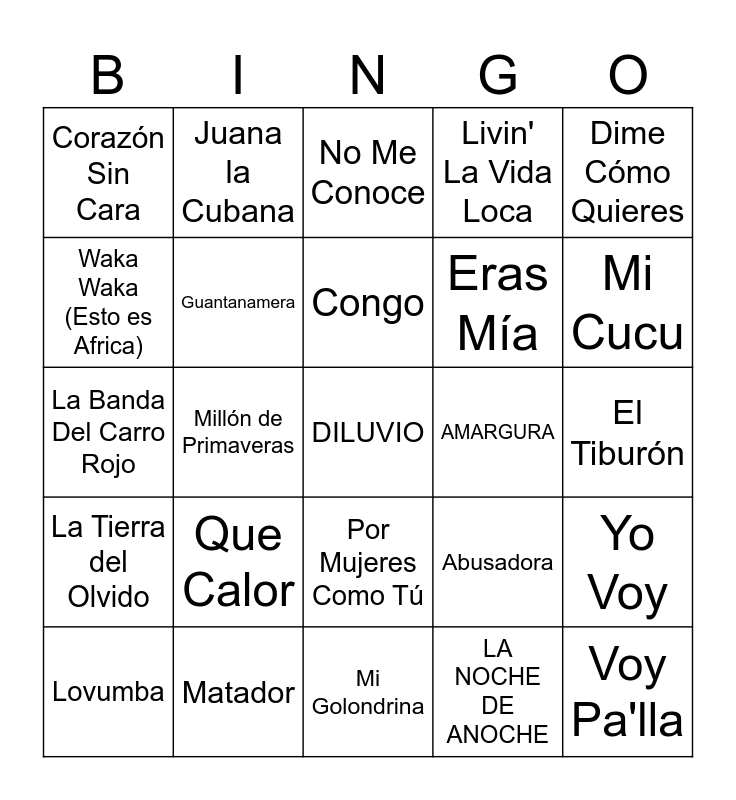This bingo card has 34 words: Voy Pa'lla, LA NOCHE DE ANOCHE, DÁKITI, MAMIII, La Tierra del Olvido, Guantanamera, Dime Cómo Quieres, Lovumba, Juana la Cubana, Guallando, Congo, No Me Conoce, La Camisa Negra, Pa' Bravo Yo, AMARGURA, Mi Cucu, Matador, La Banda Del Carro Rojo, Que Calor, Abusadora, Por Mujeres Como Tú, LADY GAGA, Corazón Sin Cara, El Tiburón, Mi Golondrina, DILUVIO, Livin' La Vida Loca, Caballo Viejo, Eras Mía, Waka Waka (Esto es Africa), Cancion Del Mariachi, Millón de Primaveras, Yo Voy and La Bamba.
