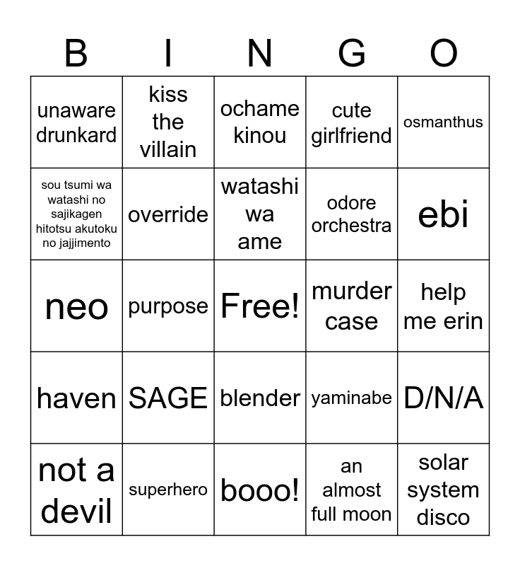 This bingo card has a free space and 24 words: SAGE, superhero, watashi wa ame, not a devil, osmanthus, unaware drunkard, sou tsumi wa watashi no sajikagen hitotsu akutoku no jajjimento, kiss the villain, murder case, blender, odore orchestra, neo, yaminabe, D/N/A, override, an almost full moon, help me erin, ochame kinou, ebi, purpose, solar system disco, haven, cute girlfriend and booo!.
