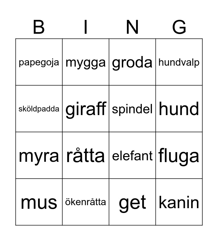 This bingo card has 20 words: fluga, fågel, groda, ko, mus, sköldpadda, ökenråtta, papegoja, myra, mygga, råtta, elefant, giraff, kanin, spindel, kattunge, hund, hundvalp, get and lejon.