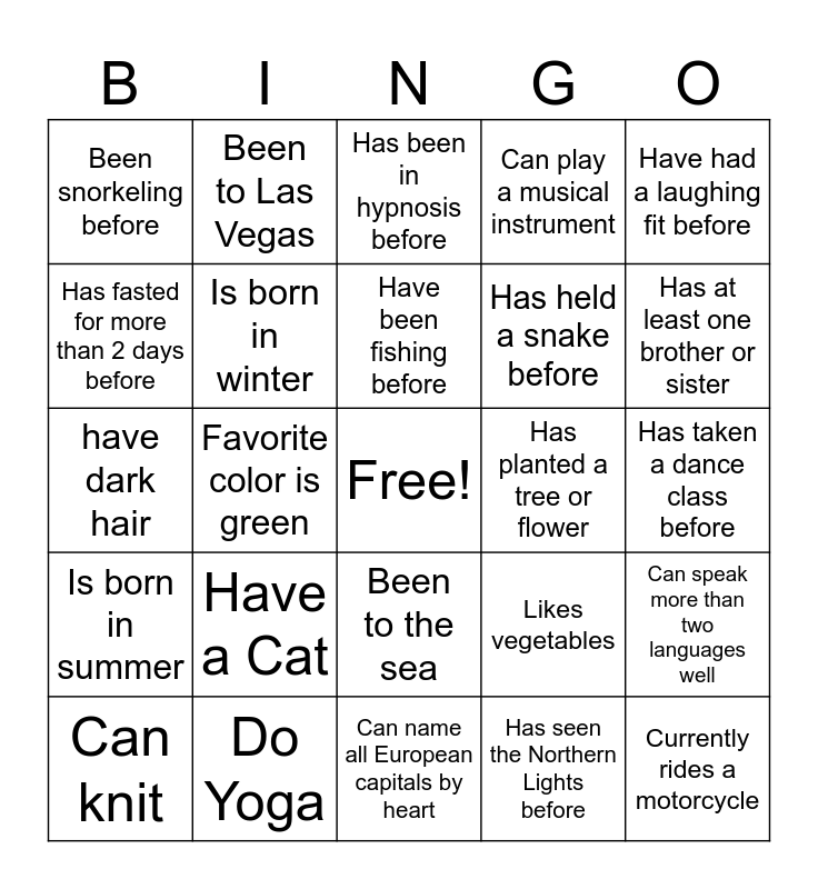 This bingo card has a free space and 24 words: Have a Cat, Do Yoga, Have been fishing before, Can knit, Have had a laughing fit before, Been snorkeling before, Has fasted for more than 2 days before, Been to Las Vegas, Has planted a tree or flower, Been to the sea, Has held a snake before, have dark hair, Likes vegetables, Can speak more than two languages well, Is born in winter, Has seen the Northern Lights before, Has taken a dance class before, Has been in hypnosis before, Has at least one brother or sister, Favorite color is green, Currently rides a motorcycle, Is born in summer, Can play a musical instrument and Can name all European capitals by heart.
