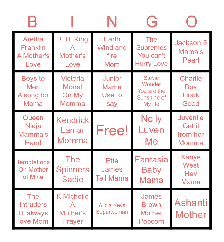 This bingo card has a free space and 29 words: The Intruders I'll always love Mom, Beyonce Ring Off, Kendrick Lamar Momma, Tupac Dear Momma, Aretha Franklin A Mother's Love, Earth Wind and fire Mom, Victoria Monet On My Momma, The Spinners Sadie, Nelly Luven Me, K Michelle A Mother's Prayer, Juvenile Get it from her Momma, Ashanti Mother, Alicia Keys Superwoman, James Brown Mother Popcorn, Charlie Boy I look Good, Anthony Hamilton Mama Knew Love, Etta James Tell Mama, Temptations Oh Mother of Mine, Jackson 5 Mama's Pearl, Queen Niaja Mamma's Hand, Fantasia Baby Mama, LL Cool J Mama said knock you out, Stevie Wonder You are the Sunshine of My life, Boys to Men A song for Mama, The Supremes You can't Hurry Love, B. B. King A Mother's Love, Kanye West Hey Mama, Junior Mama Use to say and Boosie Baby Momma.