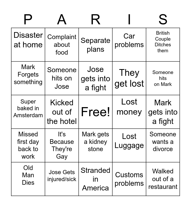 This bingo card has a free space and 24 words: It's Because They're Gay, Jose Gets injured/sick, Jose gets into a fight, Old Man Dies, British Couple Ditches them, Disaster at home, Mark Forgets something, Complaint about food, Lost money, Mark gets a kidney stone, They get lost, Super baked in Amsterdam, Lost Luggage, Someone wants a divorce, Someone hits on Jose, Customs problems, Mark gets into a fight, Separate plans, Someone hits on Mark, Kicked out of the hotel, Walked out of a restaurant, Missed first day back to work, Car problems and Stranded in America.