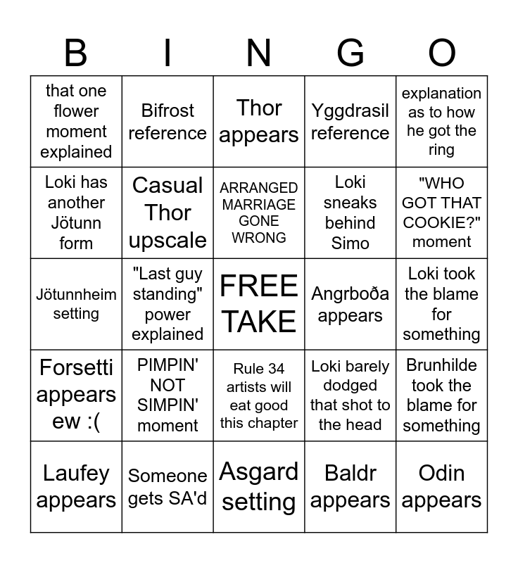 This bingo card has a free space and 24 words: PIMPIN' NOT SIMPIN' moment, Someone gets SA'd, ARRANGED MARRIAGE GONE WRONG, Laufey appears, explanation as to how he got the ring, that one flower moment explained, Loki has another Jötunn form, Bifrost reference, Angrboða appears, Rule 34 artists will eat good this chapter, Loki sneaks behind Simo, Jötunnheim setting, Loki barely dodged that shot to the head, Brunhilde took the blame for something, Casual Thor upscale, Baldr appears, Loki took the blame for something, Thor appears, "WHO GOT THAT COOKIE?" moment, "Last guy standing" power explained, Odin appears, Forsetti appears ew :(, Yggdrasil reference and Asgard setting.