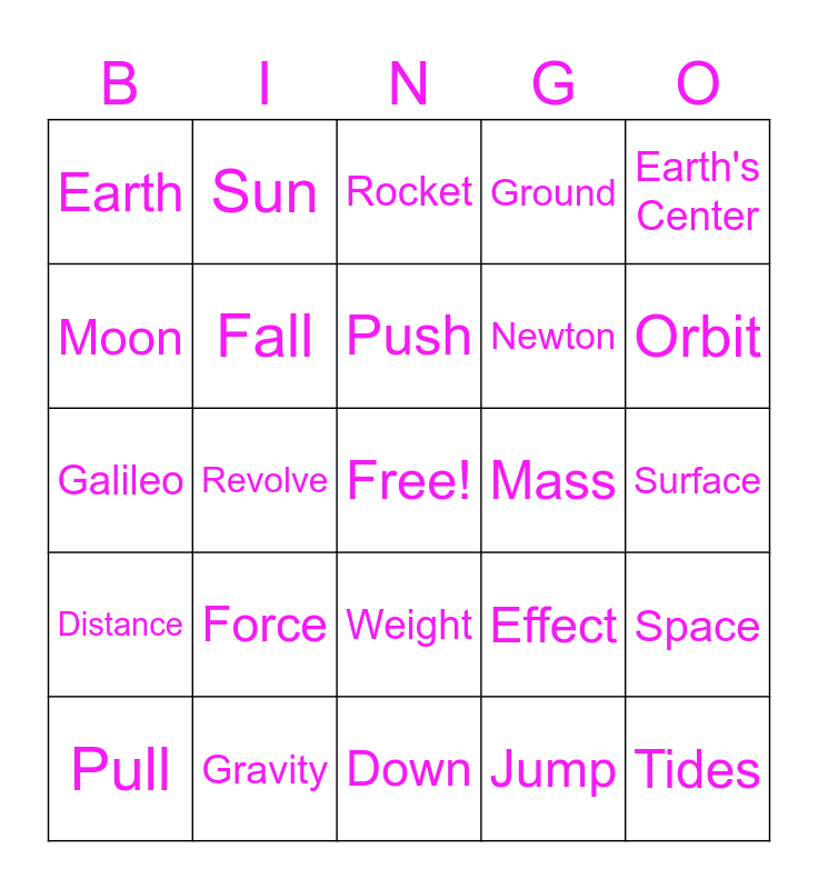This bingo card has a free space and 24 words: Force, Gravity, Push, Pull, Earth's Center, Earth, Moon, Sun, Mass, Weight, Newton, Galileo, Effect, Space, Fall, Jump, Surface, Rocket, Orbit, Revolve, Tides, Distance, Ground and Down.