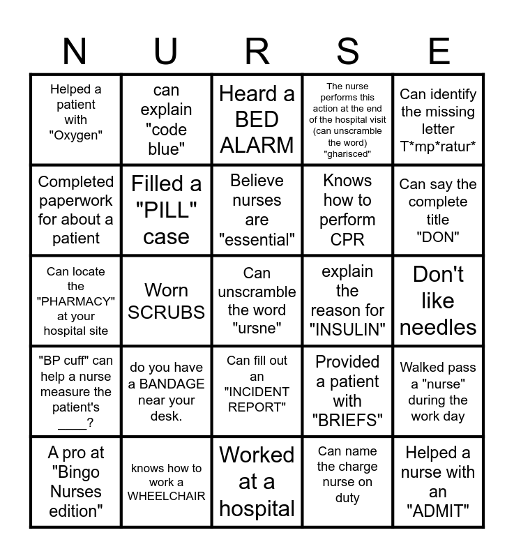 This bingo card has a free space and 29 words: A pro at "Bingo Nurses edition", Worked with a CNA, Worn SCRUBS, Knows the function of a ""SUCTION MACHINE", Helped a patient with "Oxygen", Heard a BED ALARM, Filled a "PILL" case, do you have a BANDAGE near your desk., explain the reason for "INSULIN", knows how to work a WHEELCHAIR, Don't like needles, Helped a nurse with an "ADMIT", Worked at a hospital, Can name the charge nurse on duty, Can say the complete title "DON", Can identify the missing letter "b*d, Can fill out an "INCIDENT REPORT", "BP cuff" can help a nurse measure the patient's ____?, Can identify the missing letter T*mp*ratur*, Can locate the "PHARMACY" at your hospital site, Provided a patient with "BRIEFS", Worn a hospital "GOWN", Knows how to perform CPR, Completed paperwork for about a patient, The nurse performs this action at the end of the hospital visit (can unscramble the word) "gharisced", can explain "code blue", Walked pass a "nurse" during the work day, Believe nurses are "essential" and Appreciate "nurses".