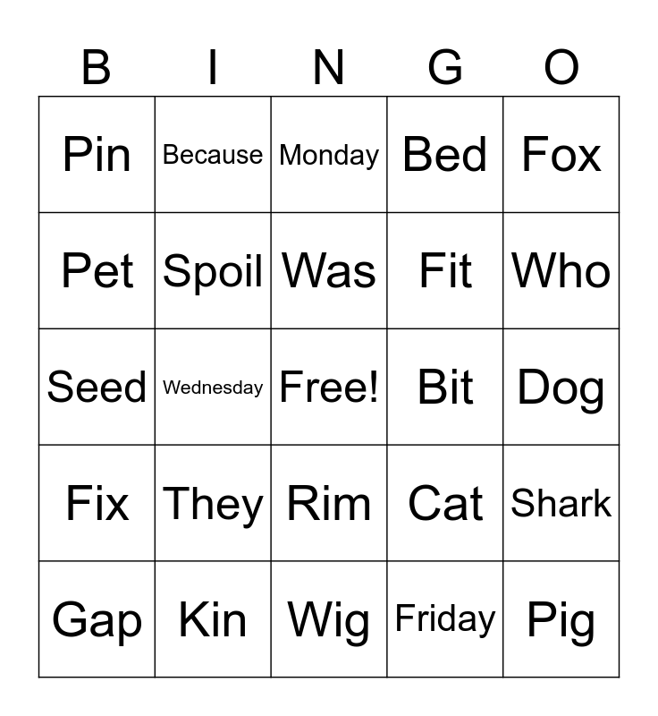 This bingo card has a free space and 54 words: Hit, Fix, Red, Jim, Rim, Nap, Bed, Jet, Pet, Fog, Pin, Cap, Kin, Gap, Log, Wig, Pig, Fit, Bin, Dog, Cat, Box, Bit, Fox, Are, Because, Crawl, Each, Fern, Friday, Have, Here, Hide, Make, Monday, Saturday, Seed, Shark, Sharp, Spoil, Start, Stone, Sunday, There, They, Thursday, Tuesday, Two, Was, Wednesday, Who, Why, Would and Verb.