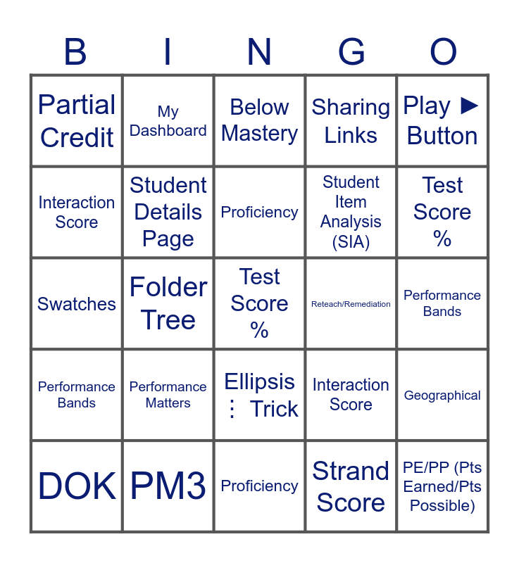 This bingo card has a free space and 62 words: Free!, PM3, Add Student Filter, Performance Bands, My Dashboard, Differentiated Instruction (DI), Student Details Page, Folder Tree, Student Item Analysis (SIA), Swatches, Sharing Links, Manage Columns, Interaction Score, Power 🗲 Insights, Hover 👆🏻 Trick, Partial Credit, PE/PP (Pts Earned/Pts Possible), Play ► Button, Ellipsis ⋮ Trick, Proficiency, Reteach/Remediation, Below Mastery, DOK, Strand Score, Power Standard, CFA/BSA, Scaffolding, High Stakes, Geographical, EOC, FAST, Performance Matters, PM3, Add Student Filter, Performance Bands, My Dashboard, Differentiated Instruction (DI), Student Details Page, Folder Tree, Student Item Analysis (SIA), Swatches, Sharing Links, Performance Matters, Manage Columns, Test Score %, Interaction Score, Power ϟ Insights, Hover 👆🏻 Trick, PE/PP (Pts Earned/Pts Possible), Play ► Button, Ellipsis ⋮ Trick, Proficiency, Reteach/Remediation, Below Mastery, DOK, CFA/BSA, Scaffolding, High-Stakes, Geographical, EOC, FAST and Strand Scores.