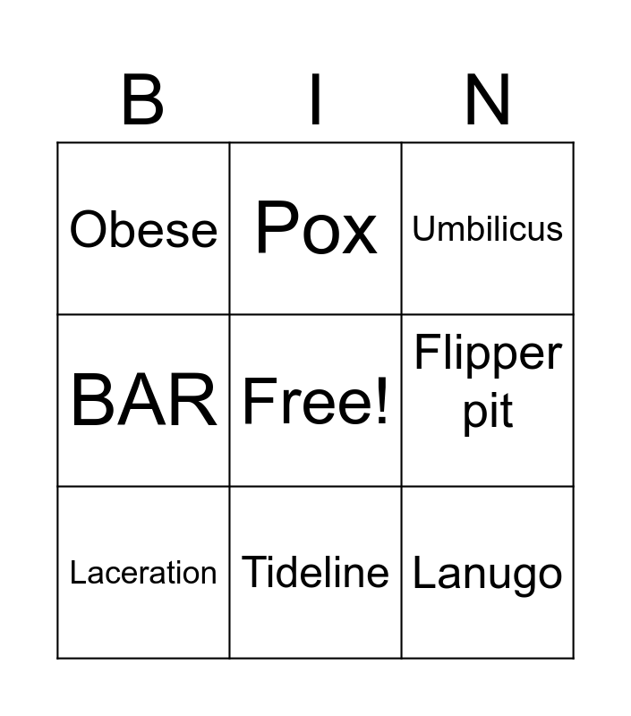 This bingo card has a free space and 8 words: Flipper pit, Umbilicus, Pox, Laceration, Obese, Lanugo, BAR and Tideline.