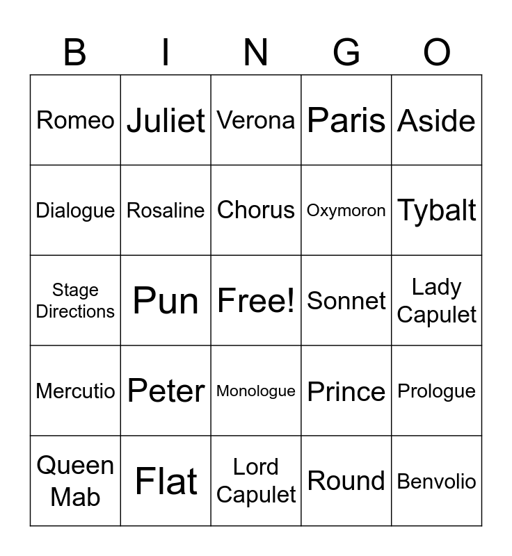 This bingo card has a free space and 27 words: Prince, Fate, Oxymoron, Lord Capulet, Dialogue, Verona, Juliet, Mercutio, Sonnet, Prologue, Stage Directions, Paris, Queen Mab, Flat, Tybalt, Sampson, Rosaline, Chorus, Peter, Romeo, Lady Capulet, Round, Pun, Benvolio, Monologue, Aside and Soliloquy.