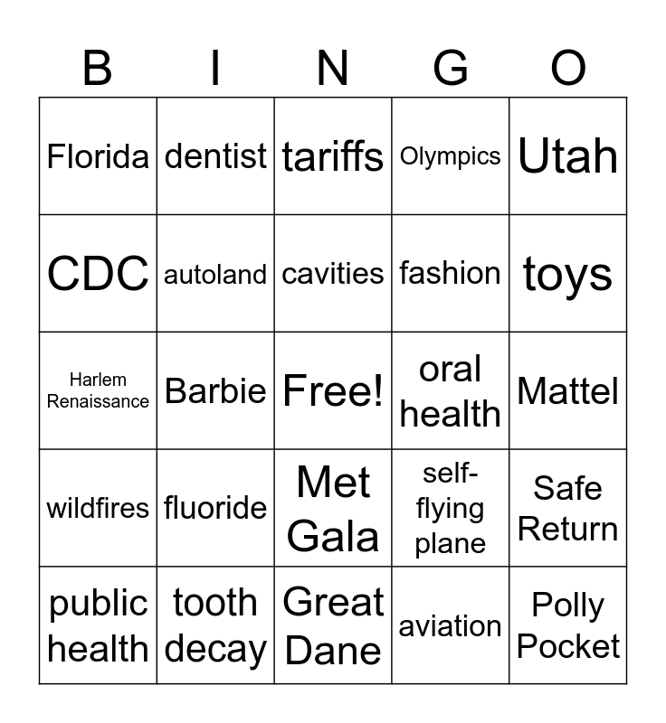 This bingo card has a free space and 24 words: fluoride, tooth decay, cavities, public health, Utah, Florida, CDC, dentist, oral health, Met Gala, fashion, Harlem Renaissance, self-flying plane, Safe Return, autoland, aviation, Mattel, tariffs, toys, Barbie, Polly Pocket, wildfires, Olympics and Great Dane.