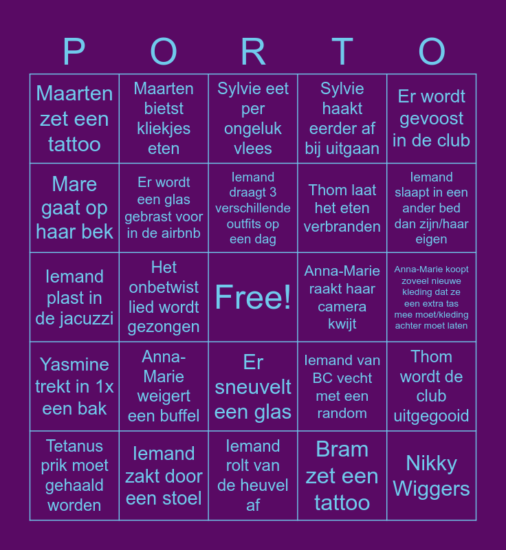 This bingo card has a free space and 49 words: ABC’er zegt Nee, Nikky Wiggers, Iemand kotst in de rivier, Iemand rolt van de heuvel af, Anna-Marie weigert een buffel, Bram bietst een sigaret, Maarten bietst kliekjes eten, Bram vraagt om het laatste stukje eten, Mare gaat op haar bek, Blote pikken borrel, Er wordt een glas gebrast voor in de airbnb, Sylvie haakt eerder af bij uitgaan, Thom wordt de club uitgegooid, Iemand van BC vecht met een random, Iemand van BC vecht met iemand van BC, Modelburger weigert iets illegaals te doen, Iemand draagt 3 verschillende outfits op een dag, Anna-Marie raakt haar camera kwijt, Iemand neemt een dame mee naar huis, Er wordt gevoost in de club, Het onbetwist lied wordt gezongen, Bram zet een tattoo, Maarten zet een tattoo, Thom laat het eten verbranden, De jacuzzi gaat stuk, Iemand slaapt in een ander bed dan zijn/haar eigen, Tetanus prik moet gehaald worden, De moeder van Yasmine wordt gespot, Er sneuvelt een glas, Yasmine trekt in 1x een bak, Er liggen meer aanstekers op tafel dan mensen aan tafel zitten, Halve liter adt, Iemand valt van de trap, Sleutel is kwijt, Iemand zakt door een stoel, Iemand struikelt op straat, Er staat een geest voor de deur, Uber voor <500m, Anna-Marie koopt zoveel nieuwe kleding dat ze een extra tas mee moet/kleding achter moet laten, Silent dinner, Floris koopt een porto shirt, De mannen halen een foute onderbroek, Iemand is buitengesloten bij de airbnb, Iemand kotst in de uber, Iemand plast in de jacuzzi, Sylvie eet per ongeluk vlees, Iemand laat een drol liggen in de wc, De Goudse middelbare kent weer een nieuw raar persoon and Iemand koopt wat van een straat verkoper.