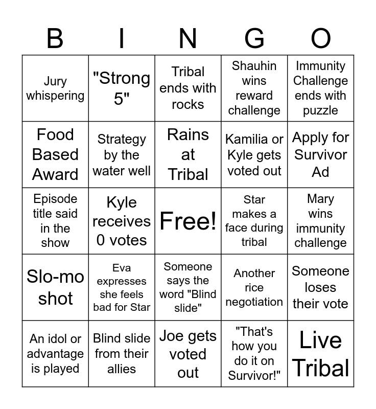 This bingo card has a free space and 24 words: Eva expresses she feels bad for Star, Blind slide from their allies, Rains at Tribal, An idol or advantage is played, Immunity Challenge ends with puzzle, Jury whispering, Food Based Award, "Strong 5", Star makes a face during tribal, Someone says the word "Blind slide", Kamilia or Kyle gets voted out, Episode title said in the show, Another rice negotiation, Someone loses their vote, Strategy by the water well, "That's how you do it on Survivor!", Mary wins immunity challenge, Tribal ends with rocks, Apply for Survivor Ad, Kyle receives 0 votes, Live Tribal, Slo-mo shot, Shauhin wins reward challenge and Joe gets voted out.