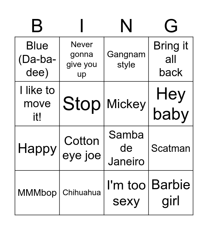This bingo card has 36 words: Fast food song, Witch doctor, Macarena, Mickey, Boom, Boom, Boom, Boom., Barbie girl, Hey baby, YMCA, I like to move it!, We like to party, Scatman, Bring it all back, Who let the dogs out, Chihuahua, Cotton eye joe, Blue (Da-ba-dee), U can't touch this, Mambo number 5, MMMbop, Gangnam style, I'm too sexy, I'll be there for you, Gonna make you sweat (everybody dance now), All star, It's raining men, Never gonna give you up, Samba de Janeiro, Tubthumping, Happy, Stop, Coco-jambo, Let me entertain you, Rock this party, Sexbomb, Grace kelly and The shoop shoop song.