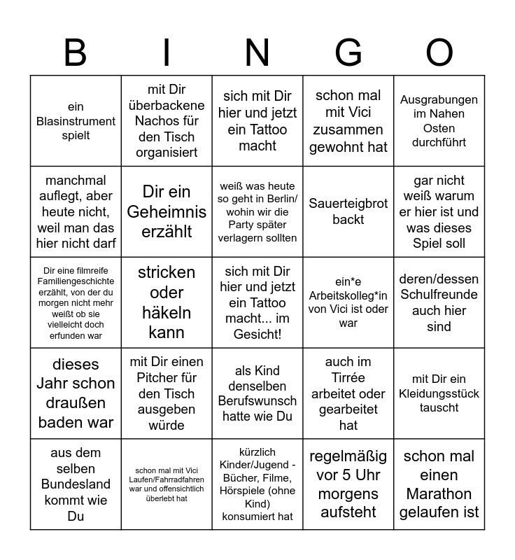 This bingo card has a free space and 29 words: aus dem selben Bundesland kommt wie Du, ein Haustier hat, stricken oder häkeln kann, gerade ein Haus / eine Wohnung renoviert, ein Blasinstrument spielt, sich mit Dir hier und jetzt ein Tattoo macht, Dir ein Geheimnis erzählt, mit Dir einen Pitcher für den Tisch ausgeben würde, ein*e Arbeitskolleg*in von Vici ist oder war, schon mal mit Vici Laufen/Fahrradfahren war und offensichtlich überlebt hat, deren/dessen Schulfreunde auch hier sind, schon mal einen Marathon gelaufen ist, kürzlich Kinder/Jugend - Bücher, Filme, Hörspiele (ohne Kind) konsumiert hat, regelmäßig vor 5 Uhr morgens aufsteht, gar nicht weiß warum er hier ist und was dieses Spiel soll, Dir die letzte Nachricht dieser verwirrenden Situationship zeigt, als Kind denselben Berufswunsch hatte wie Du, dieses Jahr schon draußen baden war, Ausgrabungen im Nahen Osten durchführt, Dir eine filmreife Familiengeschichte erzählt, von der du morgen nicht mehr weißt ob sie vielleicht doch erfunden war, auch im Tirrée arbeitet oder gearbeitet hat, kürzlich das selbe Buch gelesen hat wie Du, Sauerteigbrot backt, manchmal auflegt, aber heute nicht, weil man das hier nicht darf, schon mal mit Vici zusammen gewohnt hat, mit Dir überbackene Nachos für den Tisch organisiert, mit Dir ein Kleidungsstück tauscht, weiß was heute so geht in Berlin/ wohin wir die Party später verlagern sollten and nicht nur den gängigen Auto Führerschein hat.